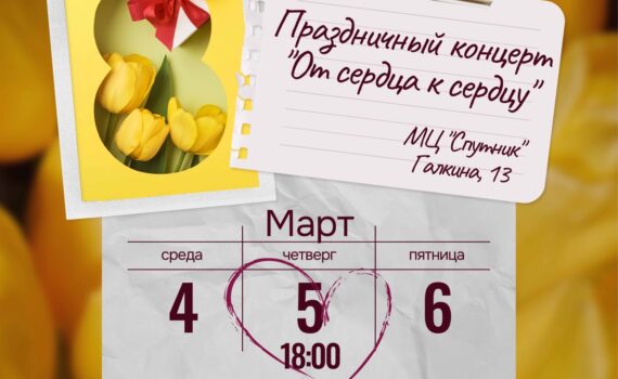 Приглашаем на теплый праздничный концерт «От сердца к сердцу» Когда: 5 марта в 18:00Где: Молодежный центр «Спутник», ул. Галкина, д. 13 В программе выступают:• Коллектив «Хор ветеранов»• Вокальный проект «Серебряный голос»• Вокальная студия «Волна»• Музыкально-театральная […]