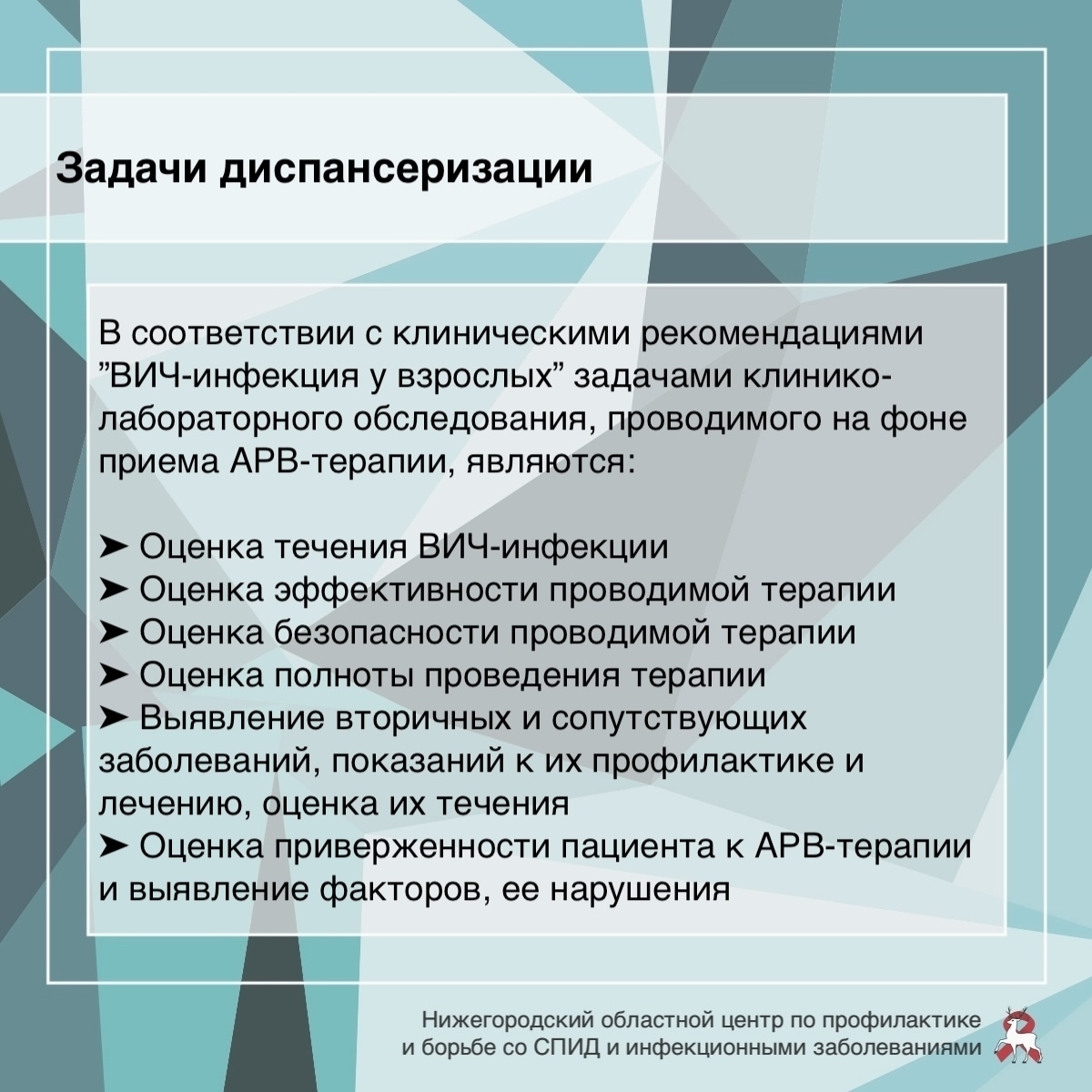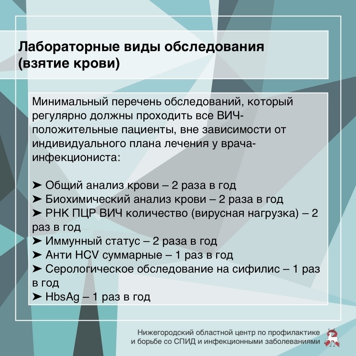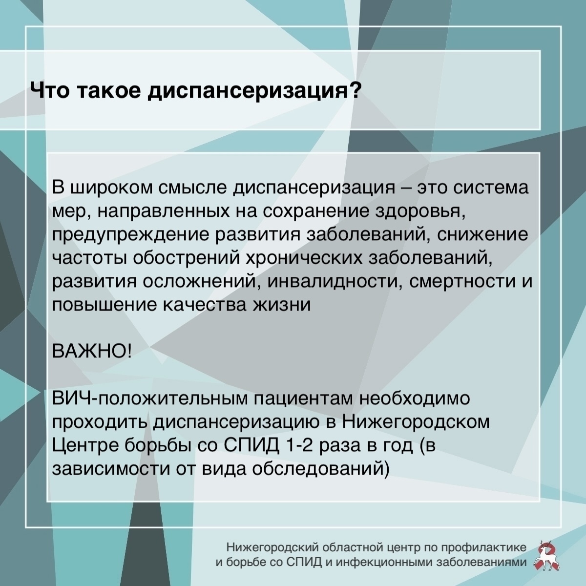Адрес: Нижний Новгород, ул. Минина, 20/3ЕПодробности о диспансерном наблюдении смотрите в карточках от ГБУЗ НО «Нижегородский областной центр по профилактике и борьбе со СПИД и инфекционными заболеваниями»