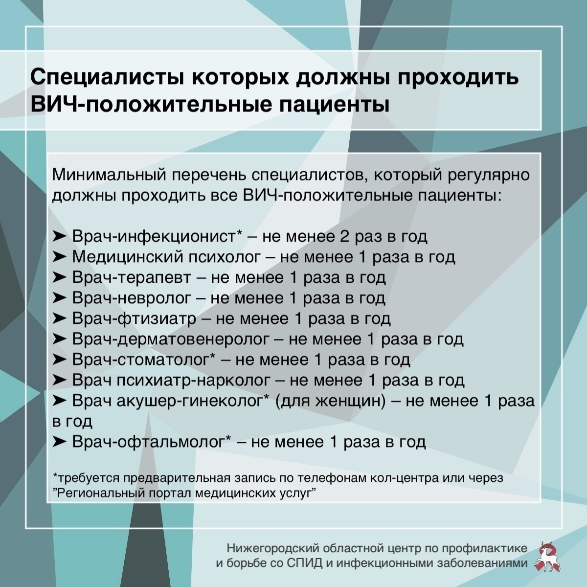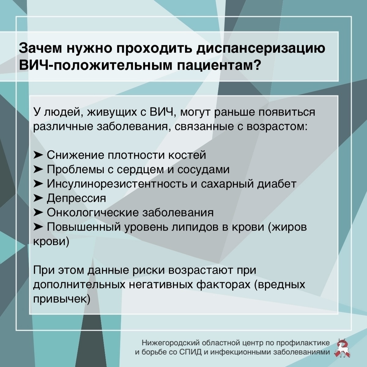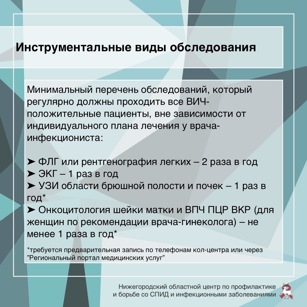 Адрес: Нижний Новгород, ул. Минина, 20/3ЕПодробности о диспансерном наблюдении смотрите в карточках от ГБУЗ НО «Нижегородский областной центр по профилактике и борьбе со СПИД и инфекционными заболеваниями»