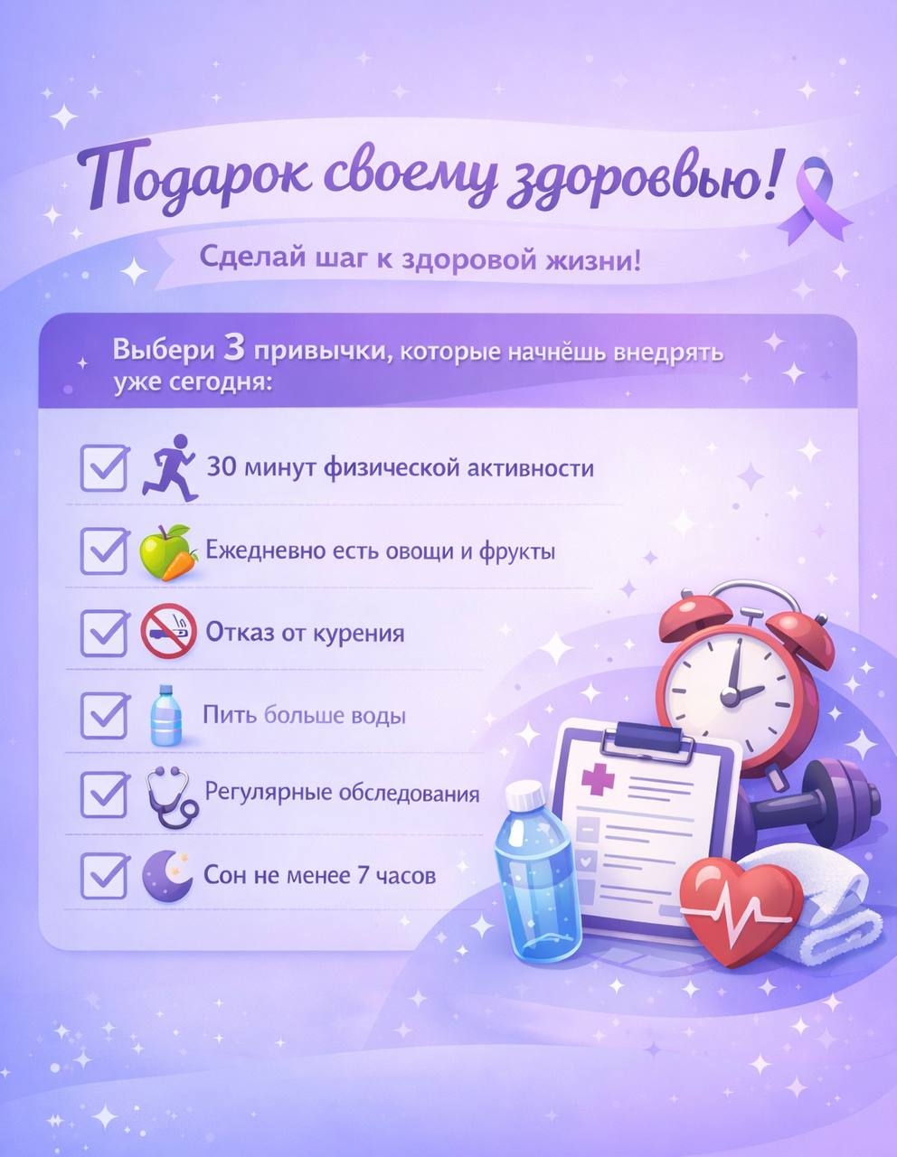 Каждый день мы можем делать маленькие шаги, чтобы снизить риск рака. Сегодня предлагаем вам интерактивное задание: выберите три привычки в комментариях и отметьте друга, чтобы он тоже присоединился!