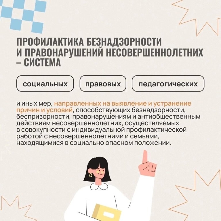 Профилактика безнадзорности и правонарушений среди несовершеннолетних включает в себя меры, направленные на выявление и устранение причин, способствующих этим проблемам. Она осуществляется посредством индивидуальной работы с детьми и их семьями в социально опасном положении.