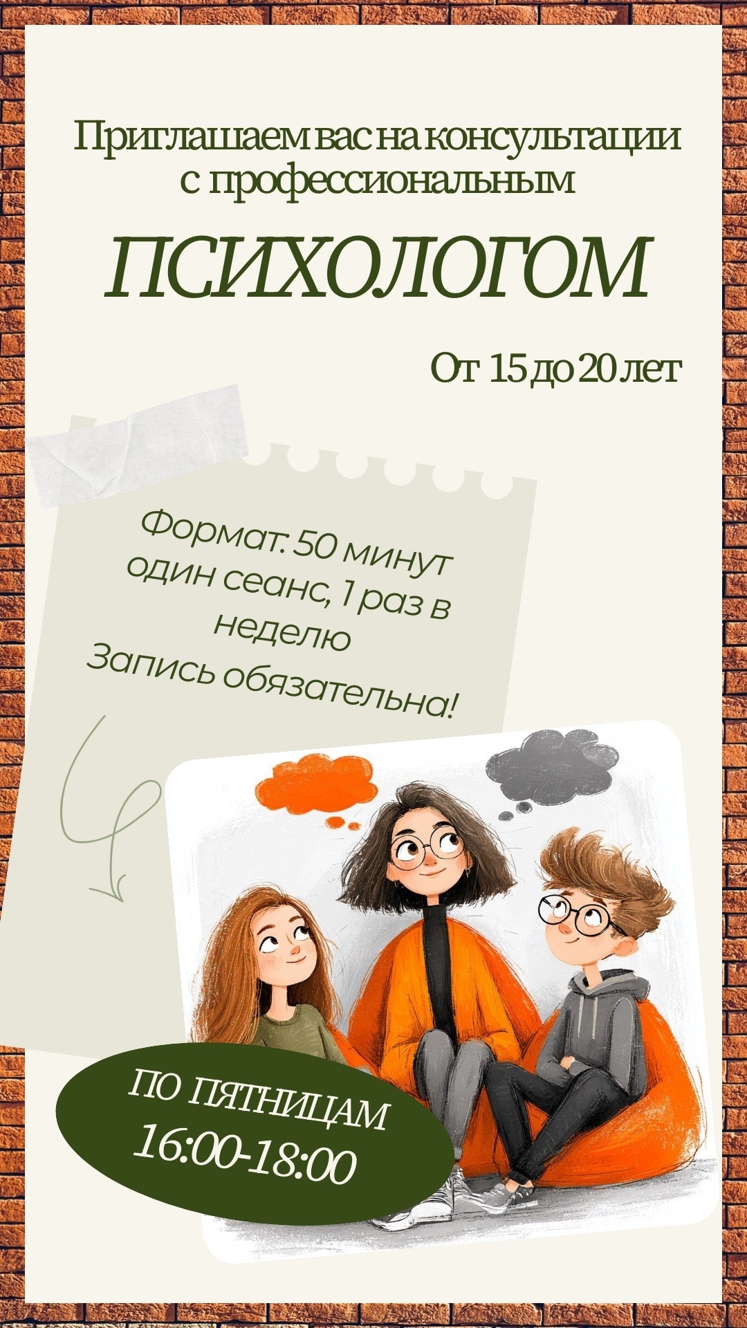 В нашем центре появилась уникальная возможность: теперь ты можешь записаться на бесплатные психологические консультации.Если тебе от 15 до 20 лет, приходи и разберись с тем, что беспокоит. Обсуждаем:
