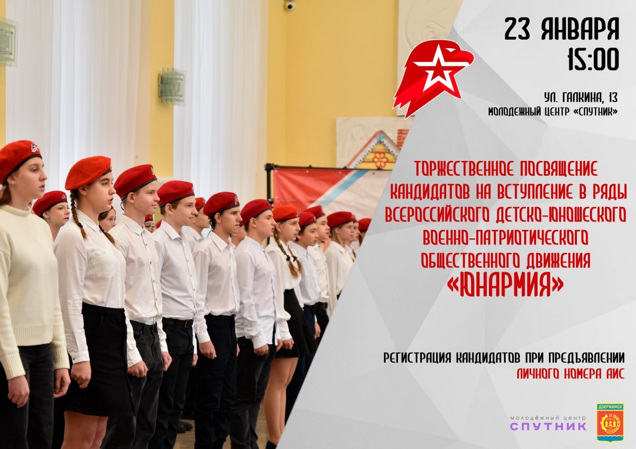 23 января 2026 года в Молодёжном центре «Спутник» состоится важное событие — Торжественное посвящение кандидатов на вступление в ряды Всероссийского детско-юношеского военно-патриотического общественного движения «ЮНАРМИЯ» города Дзержинск Нижегородской области!